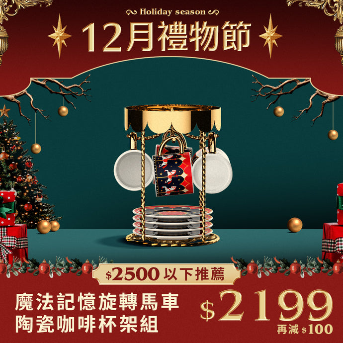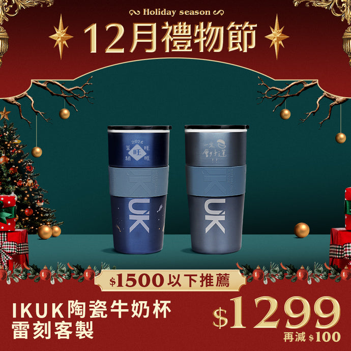 IKUK 12月魔法禮物節開跑!滿$1200折$100,雷刻兩件免費訂製。推薦三大價格帶:$500-800小資送禮(坂本馬克杯、珍奶杯)、$900-1500熱銷組合(摩卡壺組、藍瓷芯杯)、$1500-2500質感禮盒(旋轉木馬杯組、加壓摩卡壺)。附雷刻創意提案與選購建議,交換禮物送禮必看!