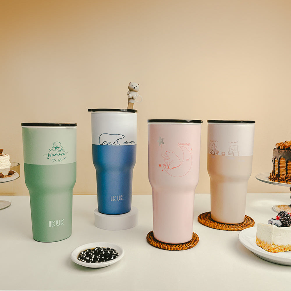 IKUK 900ml 陶瓷珍奶冰壩杯,採用1300°C高溫燒製硬白瓷內膽,保留飲品原味不殘味,專為珍奶、果汁等粗料飲品設計。附贈粗吸管與五件式實用配件,方便清洗與日常替換。大容量適合整日補水或外出手搖控使用,是結合環保、實用與美感的陶瓷吸管杯首選。