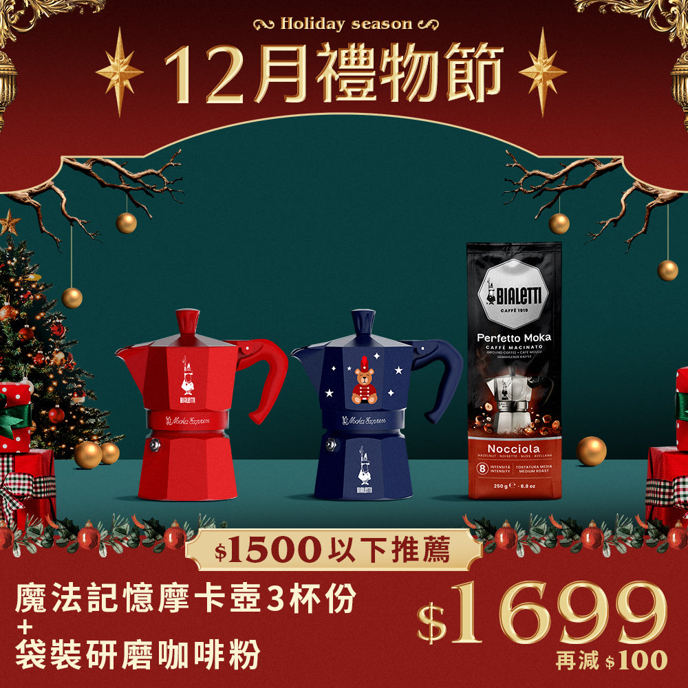 功能與結構與經典 Moka Express 相同,差異在於設計感:聖誕節限定塗裝,增添節慶收藏價值。